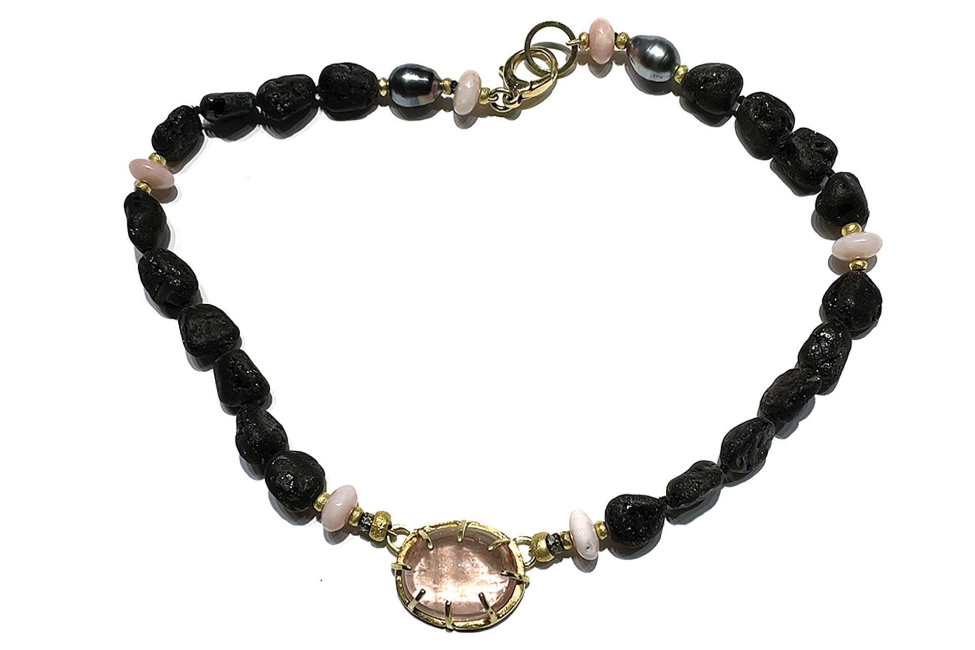 You’ll stand out day or night in this gorgeous black organic tourmaline bead necklace, with soft pink tourmaline cabochon center stone. Features diamond pavé spacer beads, pink Peruvian rondel cabochon beads, Tahitian dark gray pearls and an Italian-made, 18K gold lobster claw clasp. $3,195