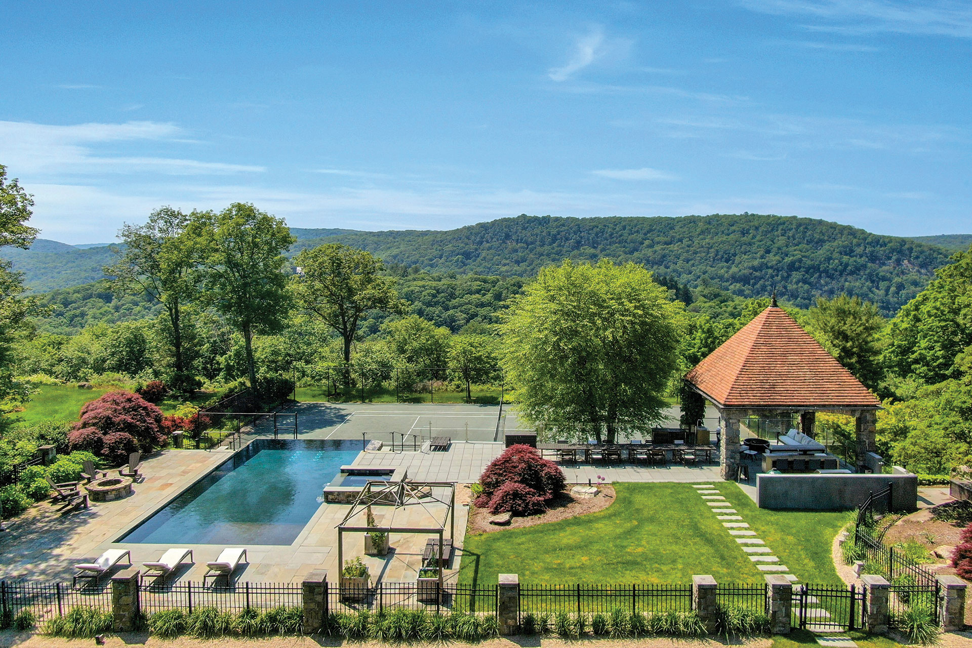Amenities include two swimming pools, a tennis court, a five-car garage, a wine cellar, a secluded log cabin, a boathouse on Tuxedo Lake and a third-floor gym.